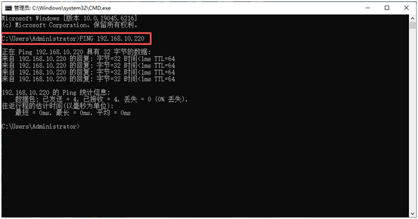 ◦ 在命令行中输入PING 192.168.10.220(此为SP-300电源默认IP,若已修改需输入实际IP),按下回车键。