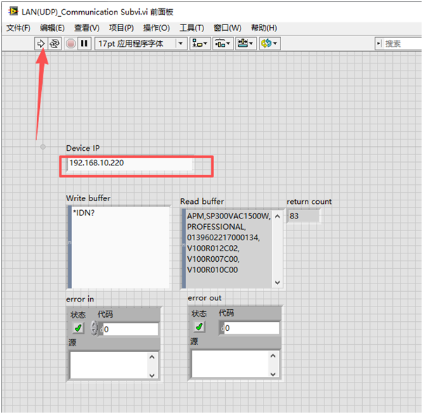 2、输入设备IP:在VI前面板的“DeviceIP”输入框中,准确填入电源IP“192.168.10.220”(如图3),确保无空格或字符错误——IP输入错误是导致通信失败的常见原因。