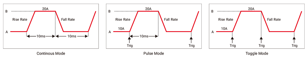 This series electronic load can be switched quickly between different values in the same operating mode, including CC dynamic mode, CV dynamic mode, CR dynamic mode and CP dynamic mode, CC/CR high speed dynamic mode up to 50kHz. This function is suitable for transient test of power supply, test of battery protection characteristic and battery pulse charging etc. Dynamic mode test has continuous mode, pulse mode and toggle mode.