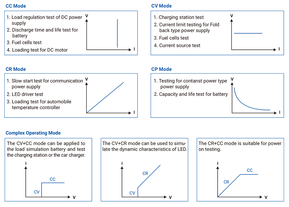 Provides four kinds of basic working mode such as CV/CC/CR/CP, and CV+CC/CV+CR/CR+CC complex operating modes
