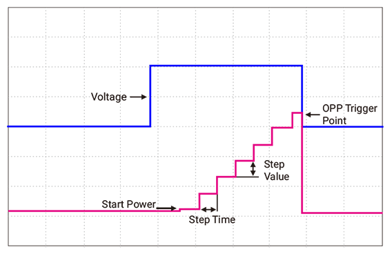 This series electronic load provides OCP and OPP modes are mainly applied in over-current and over-power points tests. After the testing the load can automatically judge the test result according to the set specifications. Take OPP testing as example, the OPP provides ramped up power for the load to test the UUT voltage whether has reached trigger voltage level and to judge if the protection is acting normally or not.