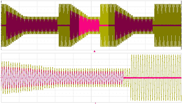 Output waveform of power source is as below. Red part is waveform of current. Yellow part is waveform of voltage. When current beyond current limited value, CC mode work. It limit current in setting value within 1400ms. When adjusting or removing the load, current is getting lower and voltage return back to setting value and enter CV mode.