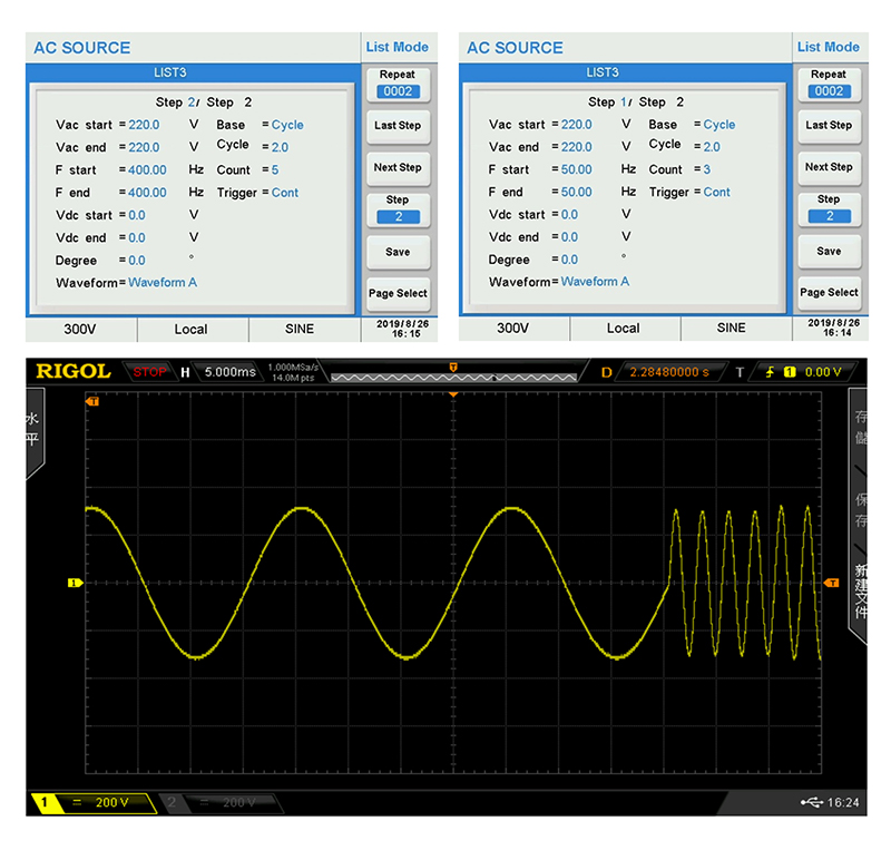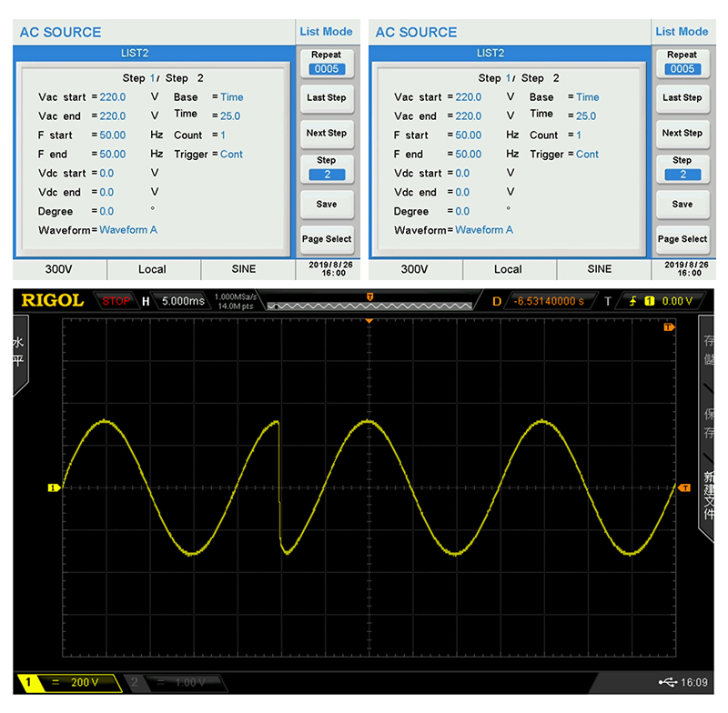 APM high performance AC source LIST function could edit 50 List files. It could name the file when use it. Each List could directly set electric parameter (such as start voltage, end voltage, angle, waveform, operation mode, time and so on). It could accurately modify outputting sudden rise, fall, interrupt and all kinds of voltage which could be applied to test product performance and function. To complicate and difficult to edit waveform, it is available to insert to AC source via USB. AC source could perfectly restore output, quick and simple to improve test efficiency.